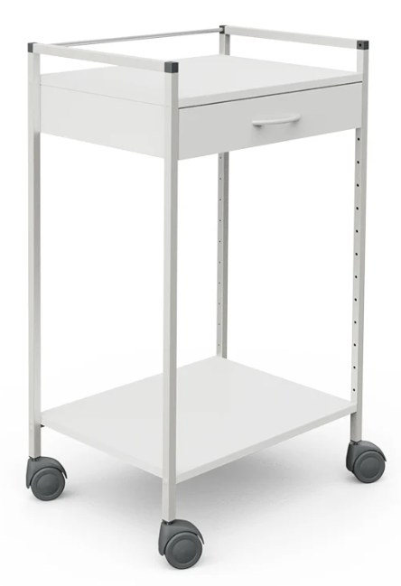 Daugiafunkcinis aukštos kokybės vežimėlis su 2 baltomis lentynomis, 1 stalčiu 10cm aukščio, bei tvirtu lakuotu plieno rėmu. Penkių sluoksnių baltos lentynos iš melamininės dervos dangos, neblunka. Atsparios įprastoms dezinfekuojančioms medžiagoms. Vežimėlis turi keturis plastikinius ratukus.