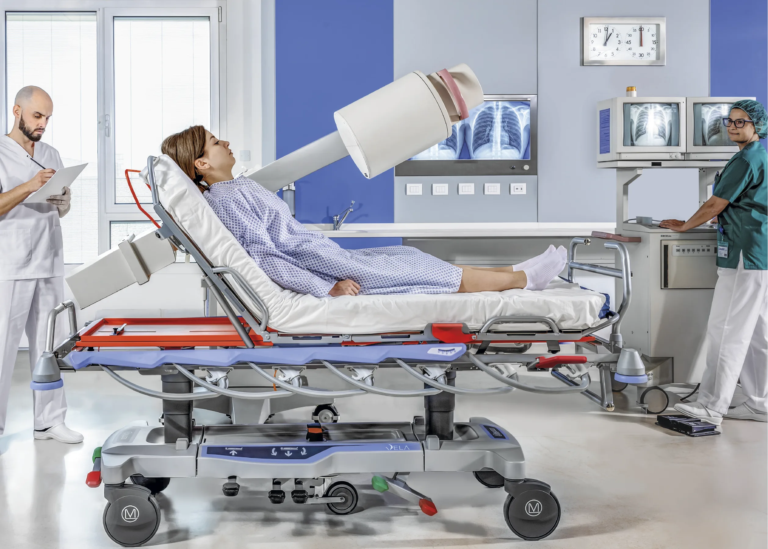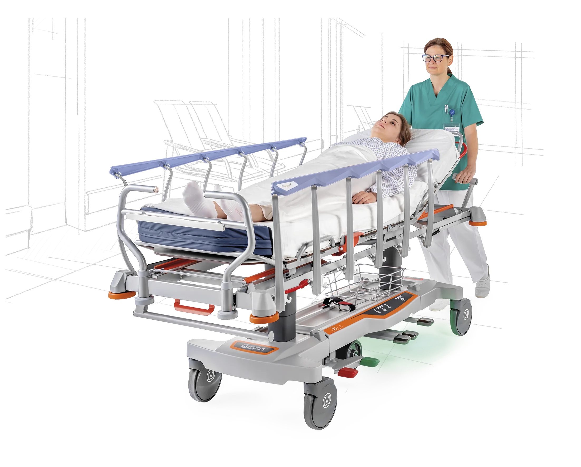 Self-propelled patient transport trolley Vela (3 parts) with hydraulic height adjustment, HPL mattress platform and chassis with a fifth electric central wheel. This is a trolley that greatly facilitates the work of nurses when transporting patients through long hospital corridors for procedures.