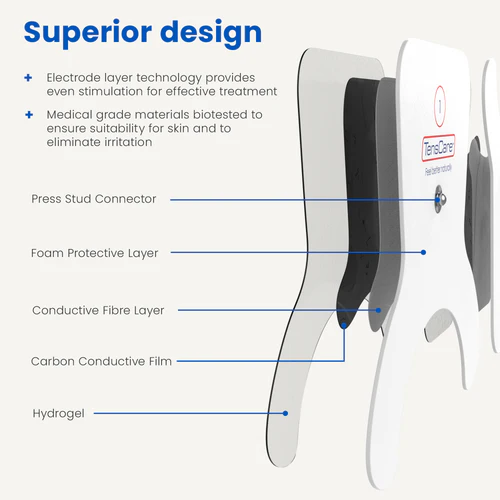 Pažangi elektrodų sluoksnių technologija – daugiasluoksnė konstrukcija užtikrina puikų laidumą ir veiksmingą stimuliaciją: apsauginis putų sluoksnis, laidus pluošto sluoksnis, anglies laidumo plėvelė ir tvirtas spaudžiamasis kontaktas.